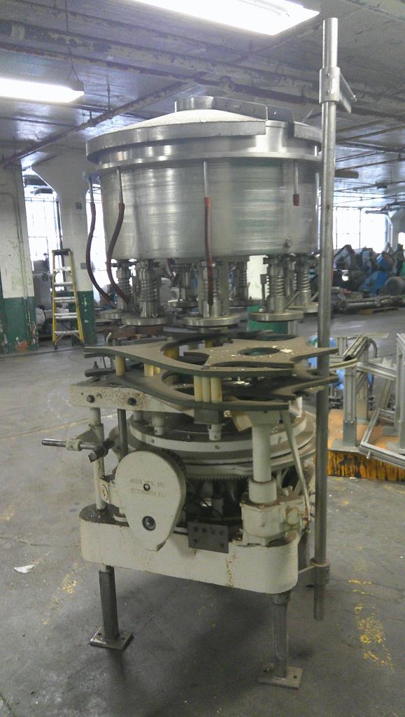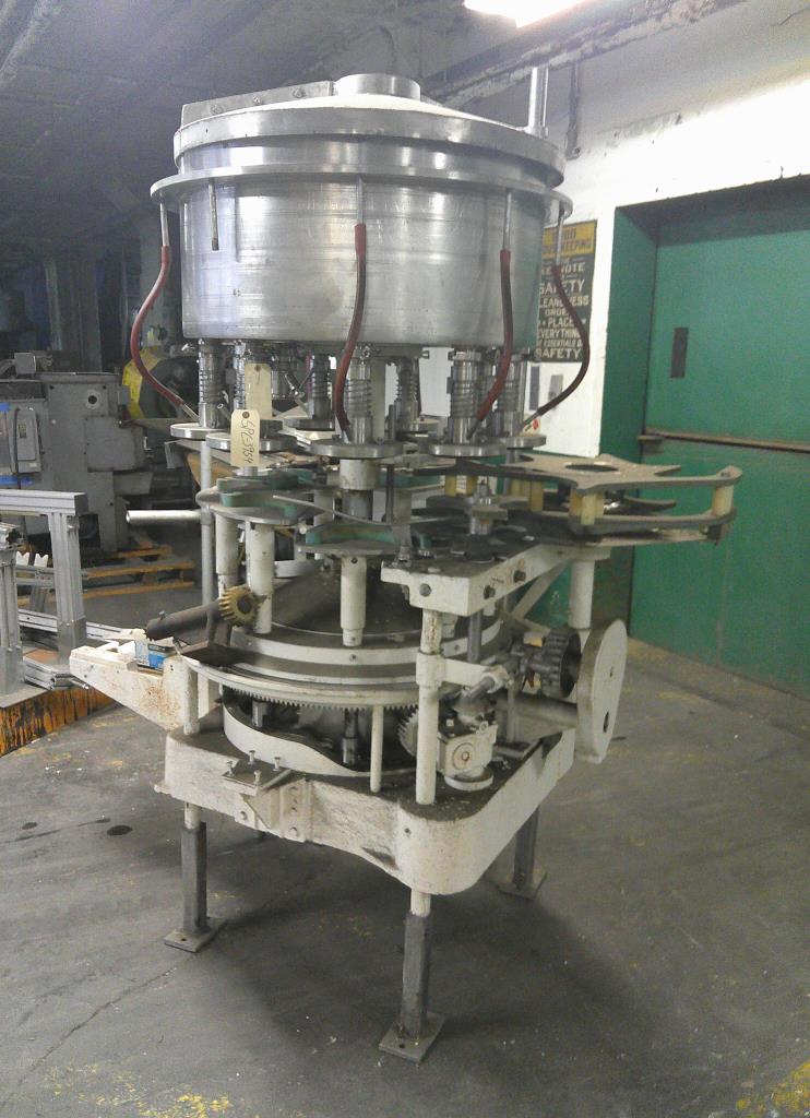 Horix 9 head gravity filler. Has 10" center between valves. Current set for filling 1 gallon jars. Lid to tank is a split, two piece dome top. Is belt driven but has no motor at this time. Has a fresh coat of paint and is good shape and turns freely. It will only take a little work to put into operation. Fair condition.Horix