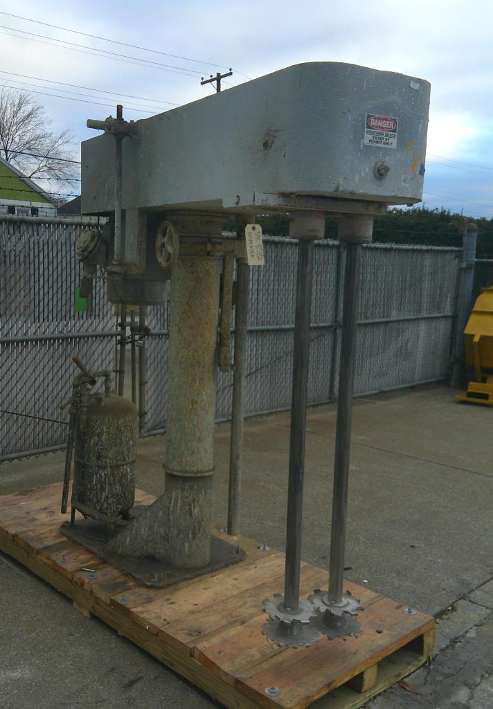This disperser has two 50" stainless steel shafts with two 8" diameter blades on each. Unit is equipped with an air over oil lift. Variable speed. Driven by a 20 hp, 1755 rpm motor that requires 230/460 vac, 3 ph electricity. Overall dimensions are approximately 32" w x 80" l x 80" h. Motor is tagged for hazardous location.Stainless Steel Contact Parts