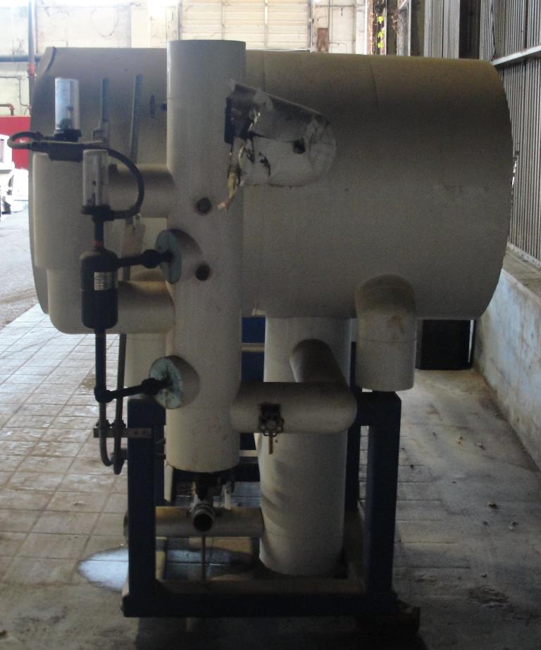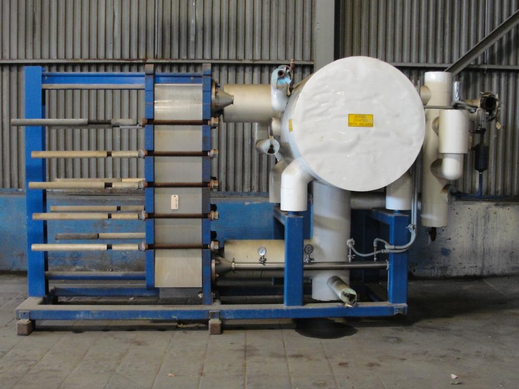 1045.9 sq.ft. GEA APV model 8WP- B2-2 heat exchanger with a 250 gallon horizontal liquid separation tank unitized on a carbon steel base. 316 stainless steel plates. The heat exchanger is rated for 150 psi @ -20 to 185F for chamber 1 and 250 psi@ -20 to 185F for chamber 2. The national board number for the heat exchanger is 9315. The liquid separator tank is rated for 250 psi @ -20 to 300F. Its national board number is 20050. This unit was part of an ammonia refrigeration system. Overall dimentions are 68.5" wide by 170" long by 90" tall.GEA APV