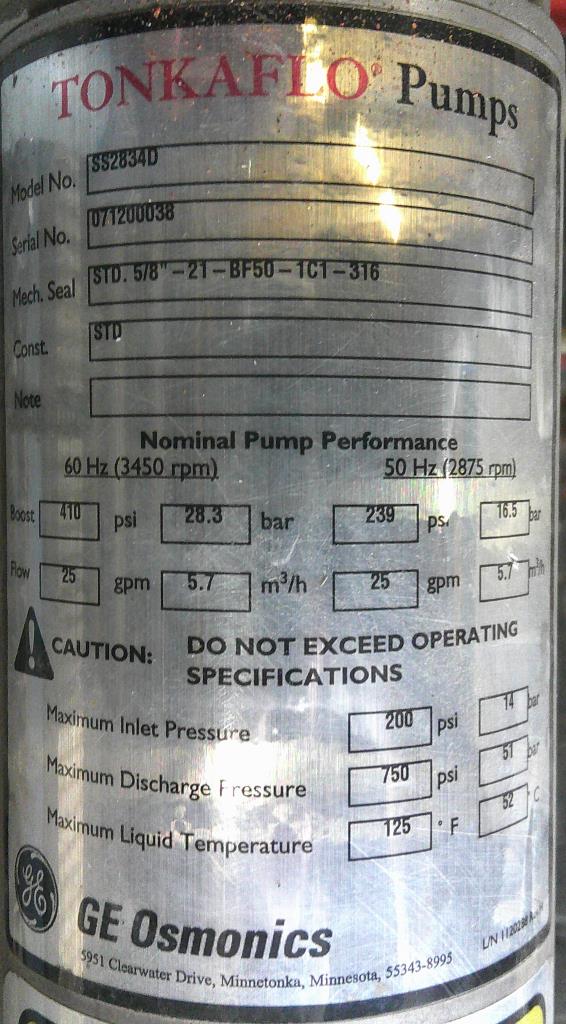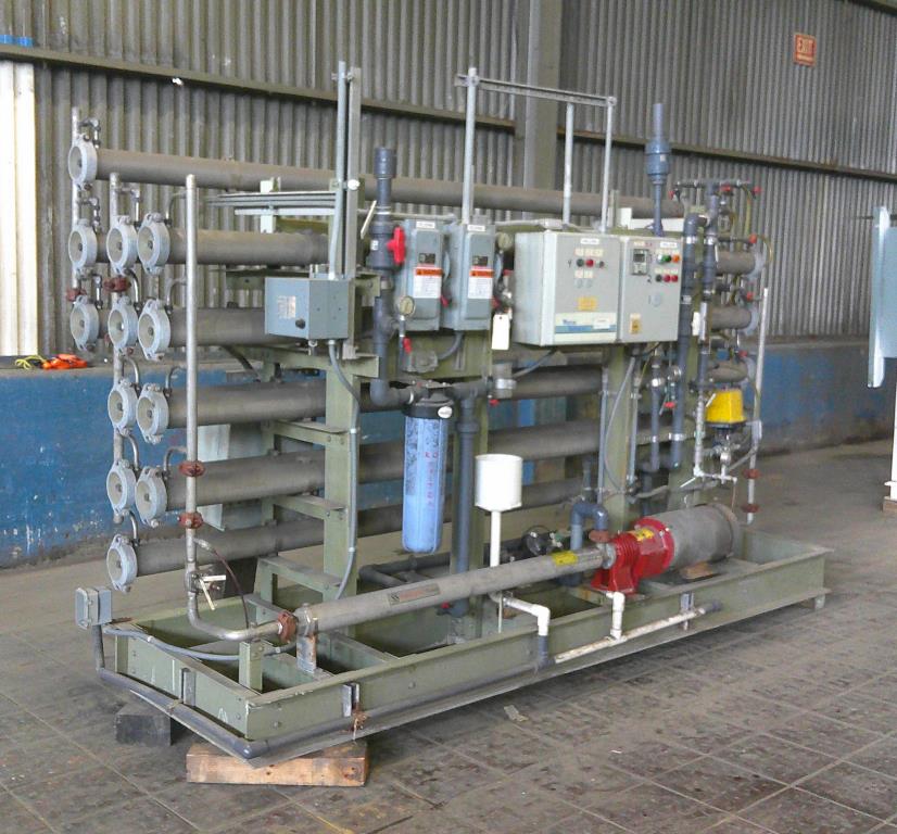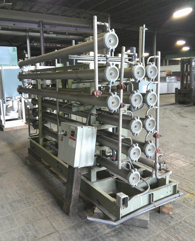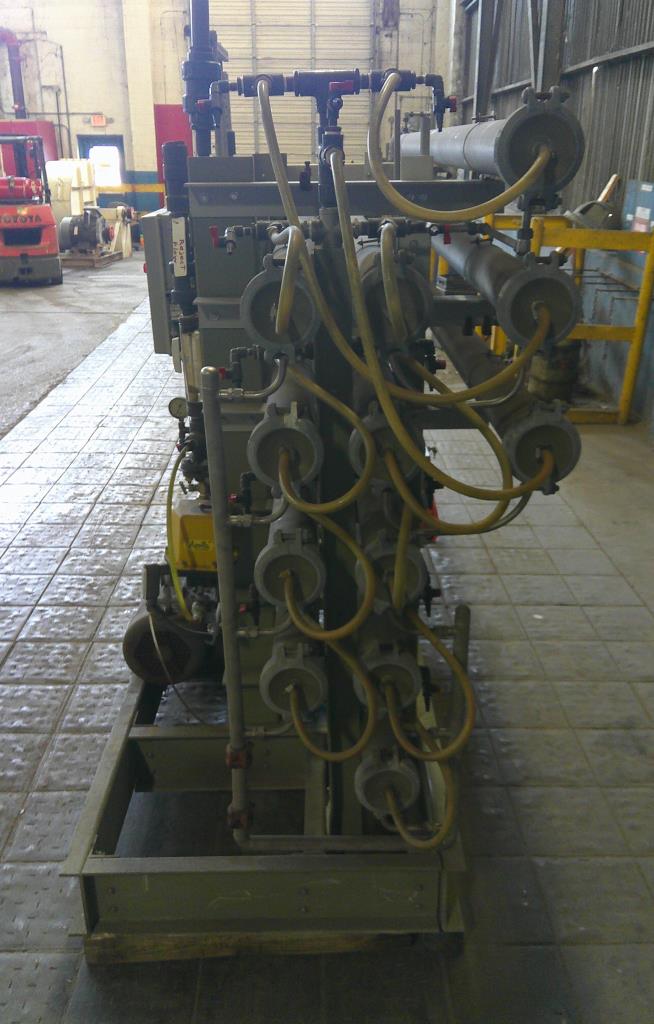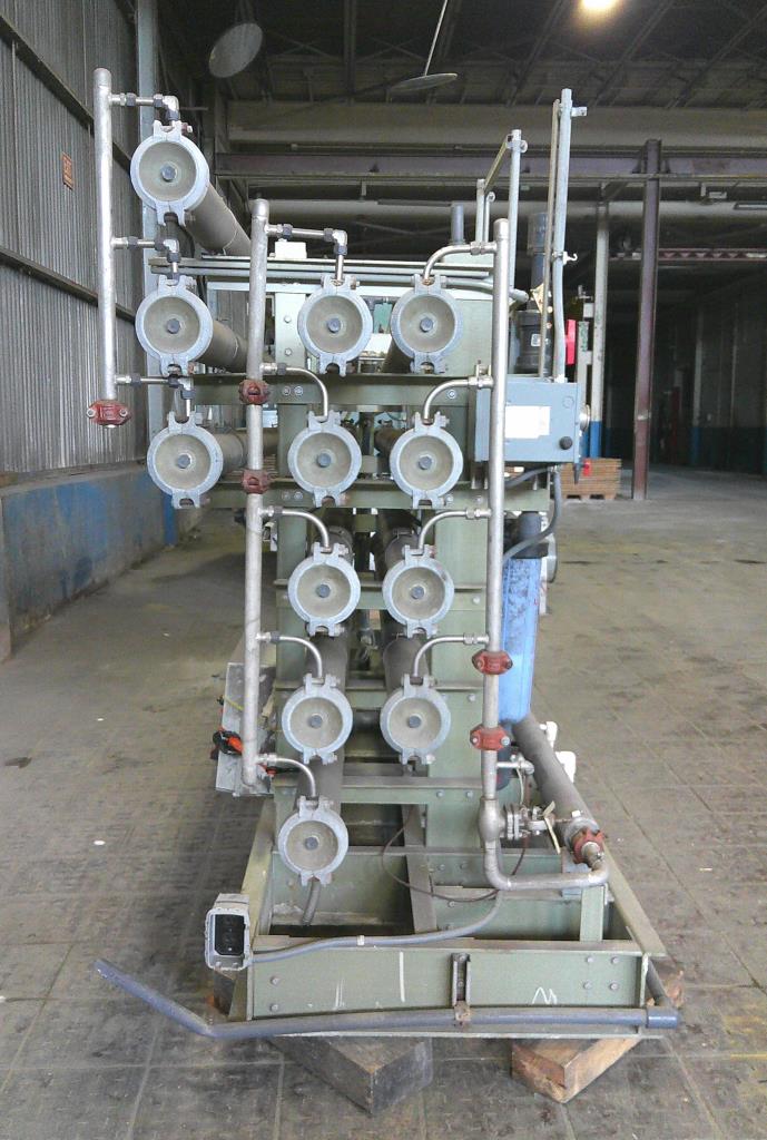 Water Services Corp. reverse osmosis filtration system. This unit has 12 stainless steel 4.5" dia. 126" long filter tubes, plc controls and a 15 hp GE Tonkaflo model SS2834D pressure pump that is rated for up to 25 gpm. This system is unitized on a fiberglass base. 230/460 vac 3 ph power required.Water Services Corp.