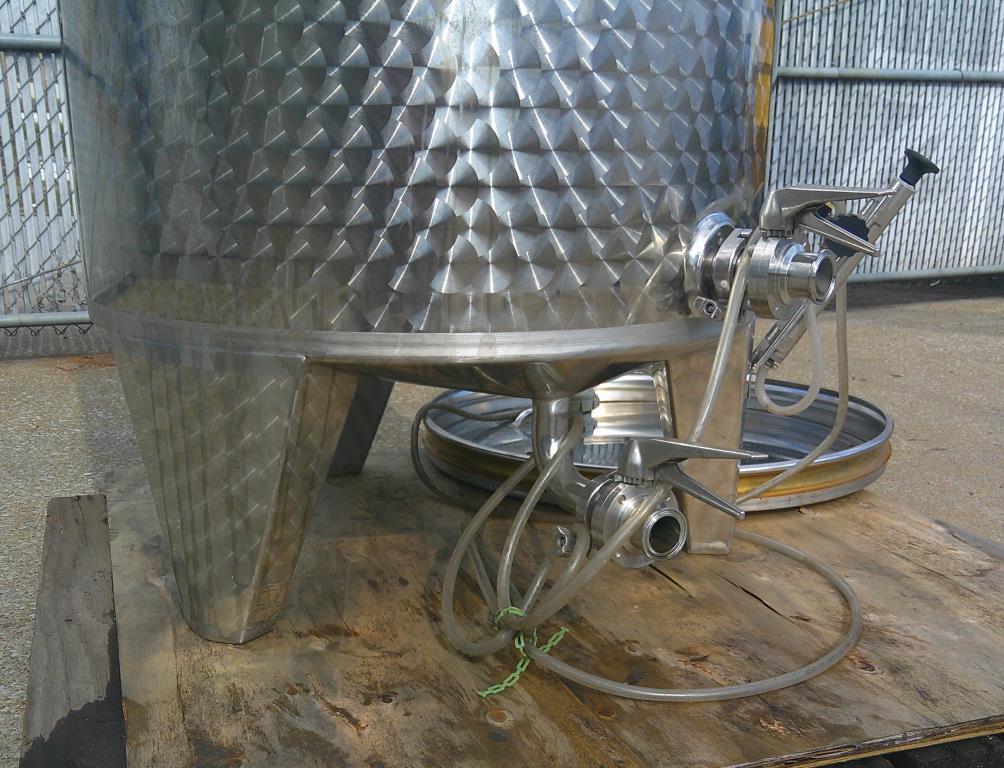 Letina 620 liter (160 gallon) tank. 304 stainless steel. 31.25" diameter x 48" SS. Tank has three legs with sloped bottom. Top lid is floating style to reduce oxygen. Bottom has 1-1/2" triclamp with valve nozzle and sample tube. Side has 1-1/2" triclamp with valve and 3/4" coupling.Letina