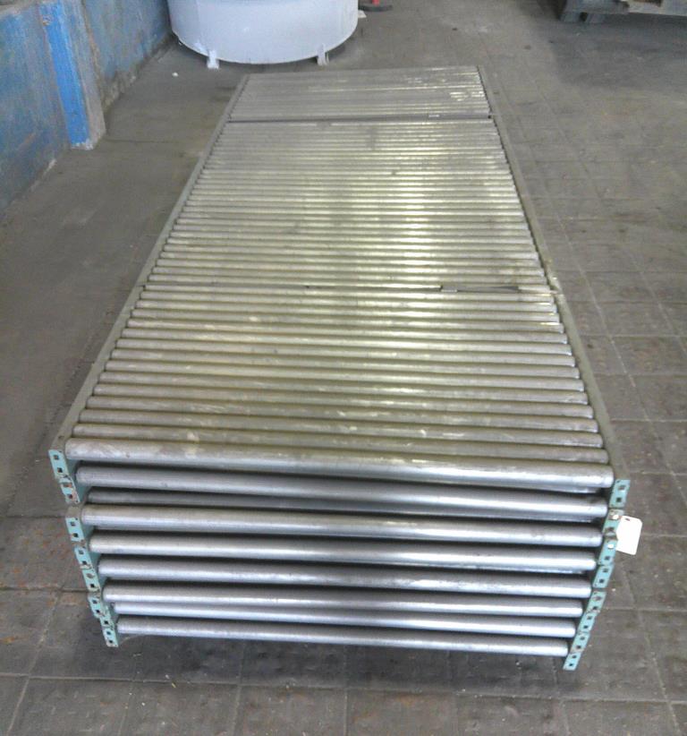 Lot of 8 4' wide by 10' long roller conveyors. The roller legnth is 47 3/4". They have a diameter of 1 7/8" and are placed 2" center to center. Occasionally, two rollers are replaced by one roller with a diameter of 3 3/8". Overall dimentions 120" long by 50 1/2" wide by 3 1/2" tall. These could be used for flow racks or unpowered pallet conveyor.Carbon Steel