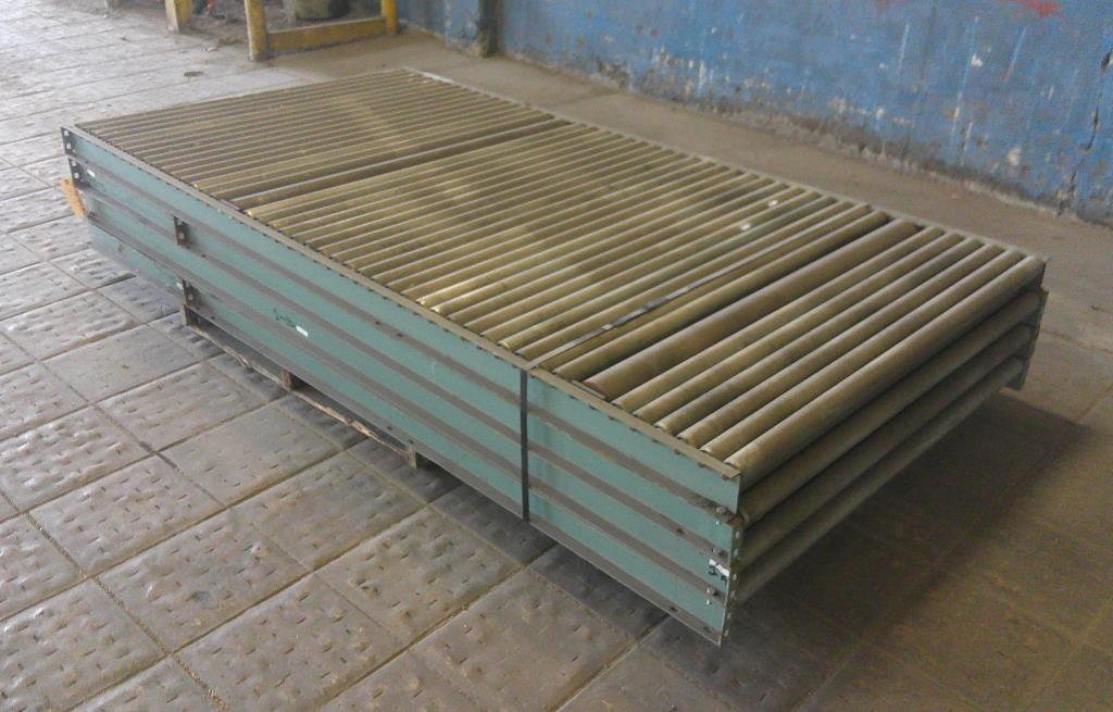 Lot of 4 4' wide by 8' long roller conveyors. The roller legnth is 47 3/4". They have a diameter of 1 7/8" and are placed 2" center to center. Occasionally, two rollers are replaced by one roller with a diameter of 3 3/8". Overall dimentions 96" long by 50 1/2" wide by 3 1/2" tall. These could be used for flow racks or unpowered pallet conveyor.Carbon Steel