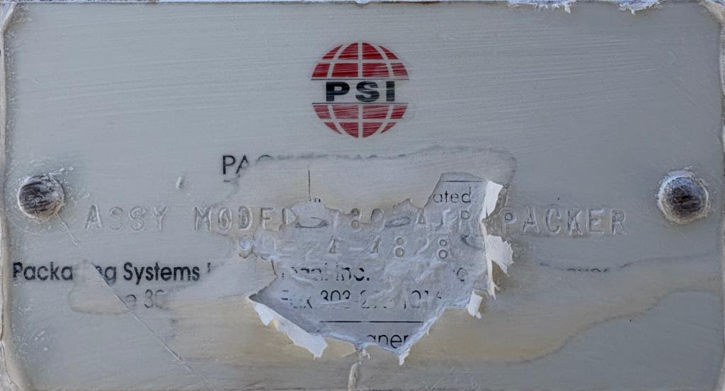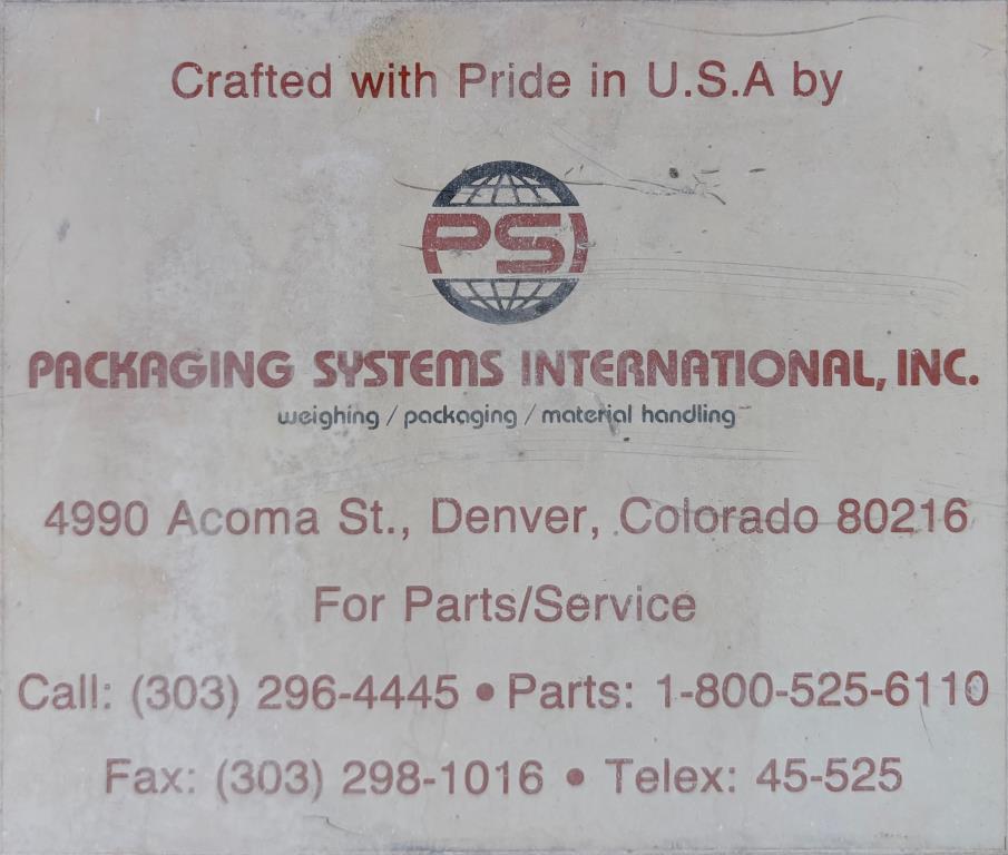 Packaging Systems International PSI model 780 air packer for 50 lb. valve bags. It has a stailess steel hopper and feed tube. This unit has a removable dust enclosure. The pneumatically operated bag door opening is 18.5" x 34". The bag chair is adjustable for different sized bags. It has an on board 7.5 hp positive displacement blower for product. It can fill about 3 bpm. 460 vac 3 ph power and air required. This unit is not designed for hazarous atmospheres. Serial number 99-24-4828. Overall dimensions are 53" wide x 93" long x 8' 9" tall.Packaging Systems International