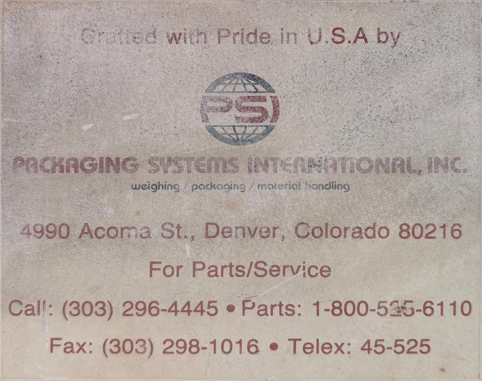Packaging Systems International PSI model 780 air packer for 50 lb. valve bags. It has a stailess steel hopper and feed tube. This unit has a removable dust enclosure.The pneumatically operated bag door opening is 18.5" x 34". The bag chair is adjustable for different sized bags. It has an on board 7.5 hp positive displacement blower for product. It can fill about 3 bpm. 460 vac 3 ph power and air required. This unit is not designed for hazarous atmospheres. Serial number 99-24-4830. Overall dimensions are 53" wide x 93" long x 8' 9" tall.Packaging Systems International