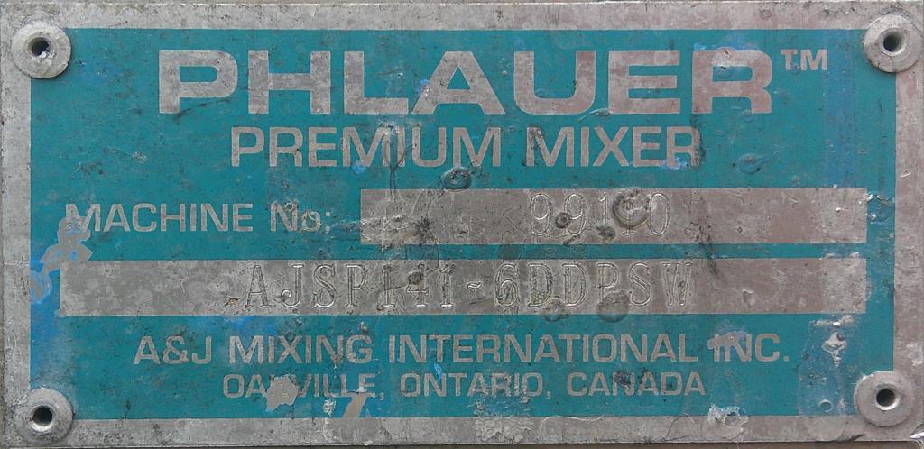 5 cu.ft. capacity Phauer model AJSP141-6DDPSW twin shaft paddle blender with a side entering chopper. Stainless steel constuction. The twin shaft paddle blender has a 1.5 hp drive on each shaft and the chopper is driven by a 3 hp motor. This unit is equipped with a small dosing tank with spray nozzels. The pipe to the spray nozzels is threaded brass but should be easy to replace with stainless fittings if necessary. The control panel is mounted at one end with a VFD. It is all mounted on a stand with casters for mobility. This unit requires 600 vac 3 ph and includes a 480 to 600 vac step up transformer. Overall dimensions are 80" wide x 52" long x 48" tall. Serial number 99110.Phlauer