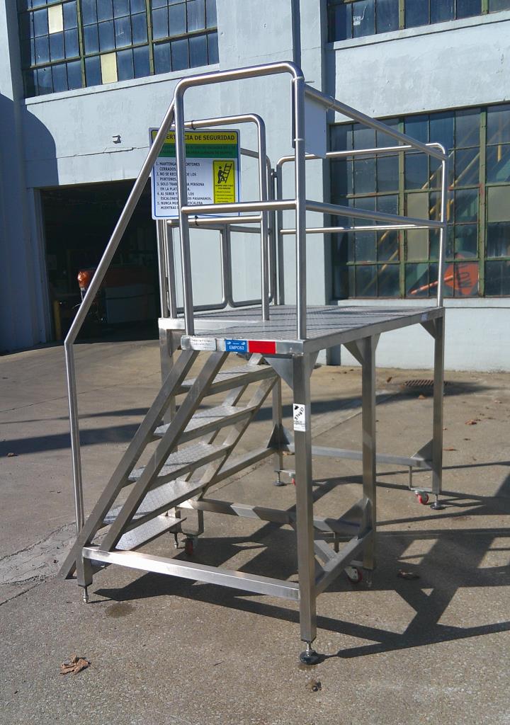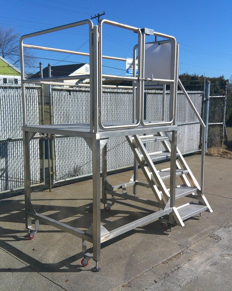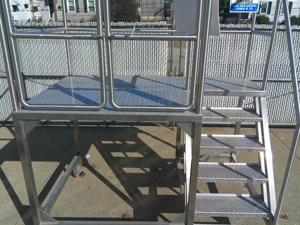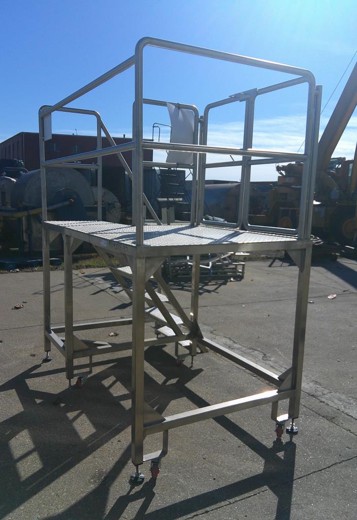 The platform area is 21.6 sq ft. Fabricated from stainless steel tube steel and stainless diamond deck plate. The walk area dimensions are 80" by 48" with a 26" by 28" cutout for the stairs. Unit has 5 stairs 28" wide. Platform fabricated from tube steel and diamond deck plate is rated for 550 lbs. Unit has casters and six adjustable feet. Overall dimensions are back side 80" wide, front side at gate 52", gate side 48" wide, 46" loading thru the gate. Overall height at gate 90.75". Overall height at the back rail 87".Bemier Machine Shop