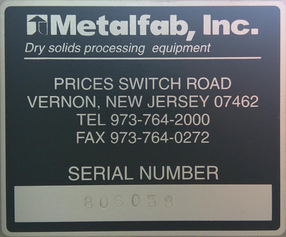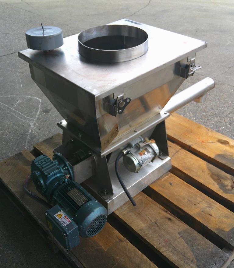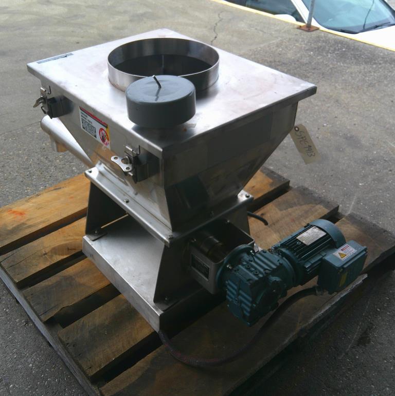 Metalfab model MT-3 volumetric screw feeder. Stainless steel construction. The hopper is approximately 2 cu.ft. The feed tube has an OD of 3.5" and a legnth of 22" to the center of the discharge. This screw feeder has a bin vibrator. 12" dia inlet opening and vent in the clamp on hopper lid. Driven by a 1 hp 230/460 vac 3 ph gearmotor. Serial # 806038. Good condition.Metalfab