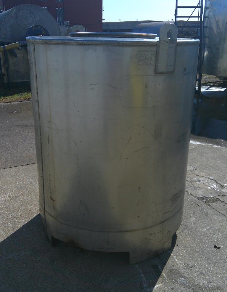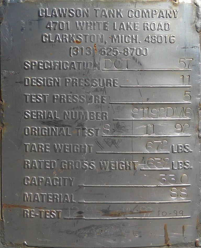 Clawson Tank Company 330 gallon stainless steel tank. Serial # 81192DM6. The diameter is 45" and the straight side legnth is 48". The manway on top is 22.5" in diameter. No lid. The inlet on top and the outlet below have an inside diameter of 2.25" and are threaded. Overall dimentions are 46" wide by 46" long by 60" tall.Clawson Tank Company