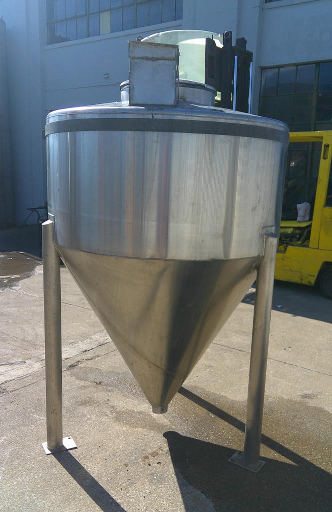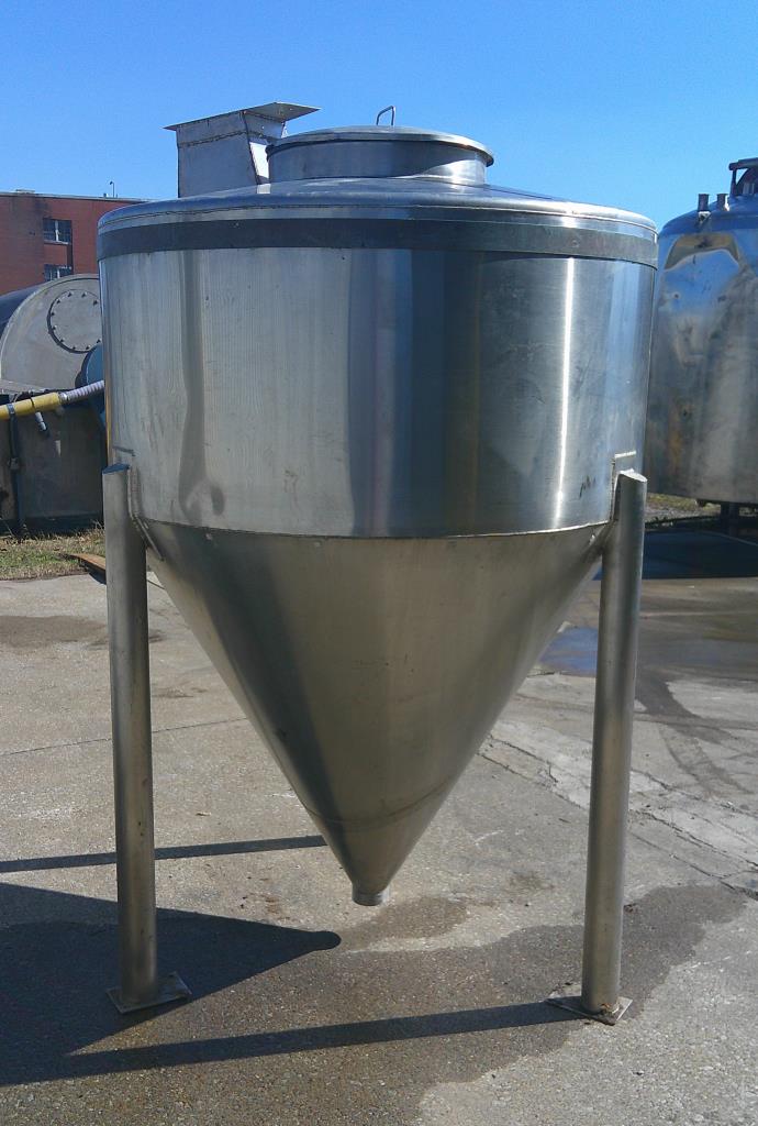 380 gallon vertical cone bottom stainless steel tank. 52" OD x 24" straight side. 52" long cone. Flat top with 20" lidded manway and 8" x 7" open chute. 3/4" triclamp side nozzle. Bottom drain 4". Tank has three legsStainless Steel