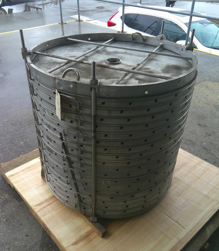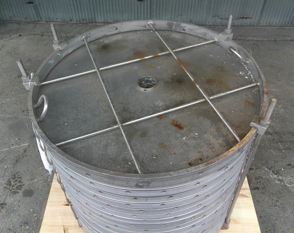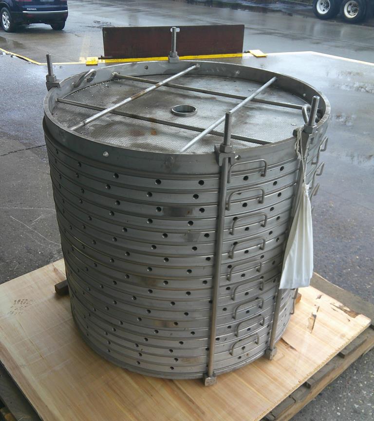 Horizontal plate stack for 33" sparkler filter. There are 18 shallow stainless steel plates. Bolted together with 4 tie rods to form 35.5" tall stack.Sparkler