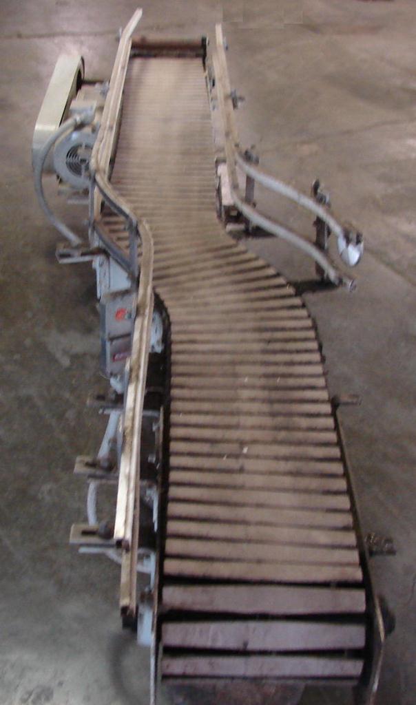 Table top conveyor. Carbon steel frame with plastic belt. 10" wide x 9' long with a 6" offset. Comes with guide rails with end stop of pack off use. Drive by Reliance 1 hp gear drive assembly with a ratio of 56/262-30. Requires 230 vac 3 phase electrical supply. Good condition.Carbon Steel