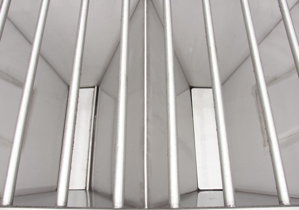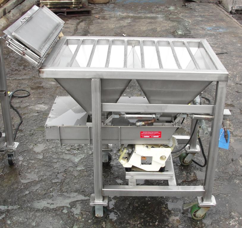 Eriez HI-VI vibratory Equipment mobile stainless steel vibratory feeder model 484. The 2 cu ft feeder has a dual channel hopper with a 36" x 24" grated top with lid 40" from the ground, (2) 14.5" x 4" hopper outlet with flaps, and a vibratory feeder 16" x 3.75" outlet 20" from the ground. The hopper dumps into the vibratory feeder that is 16" wide x 3.75" tall x 30" long. The whole unit has a stainless steel frame with casters for mobility. Overall dimensions are 43" long x 32" wide x 43.25" tall. Requires 115 vac 1 phase electrical supply and air supply.Eriez