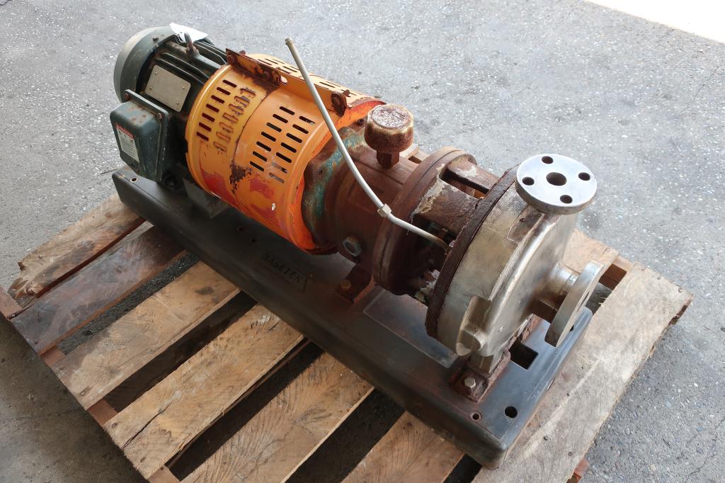 Used Goulds centrifugal stainless steel pump. Pump has a 2" diameter inlet and a 1" outlet. It has an estimated 11" dia impeller. Mount on a basetek non-metallic polymer concrete baseplate. Driven by a 5 hp 1735 rpm motor. Requires 460 Volts electrical supply.GOULDS
