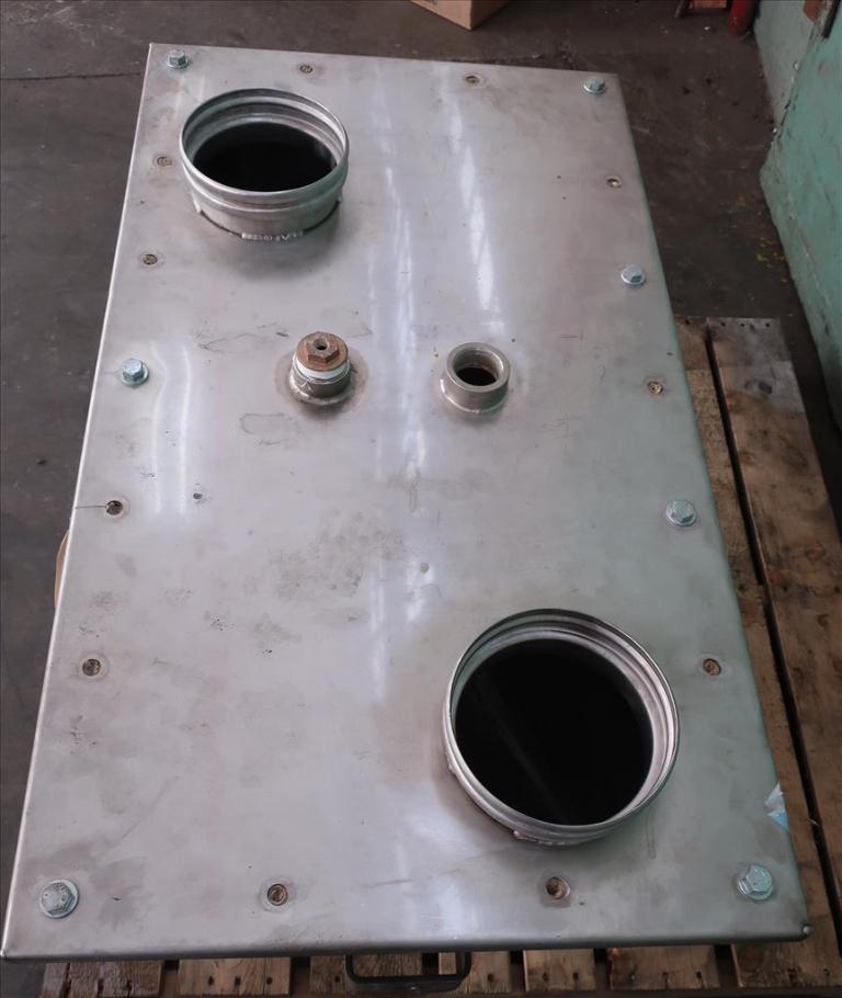 Approximately 5.33 cu.ft.total capacity rectangular bulk storage bin constructed of stainless steel. The straght section is 18" wide x 36" long x 8" high. The pyramidal bottom is 18" wide x 36" long x 13" tall. The bottom has a 7.75" flanged connection. The bolt on top has 2 each 6.5" openings and 2 each 1.5" threaded connections. Good condition.Stainless Steel