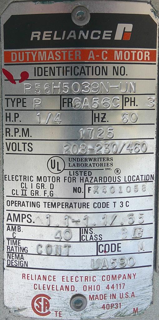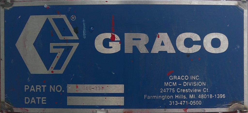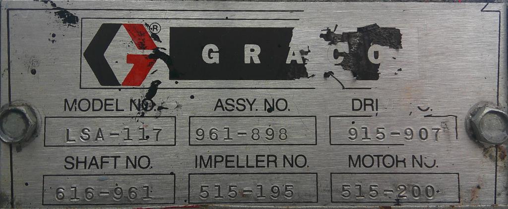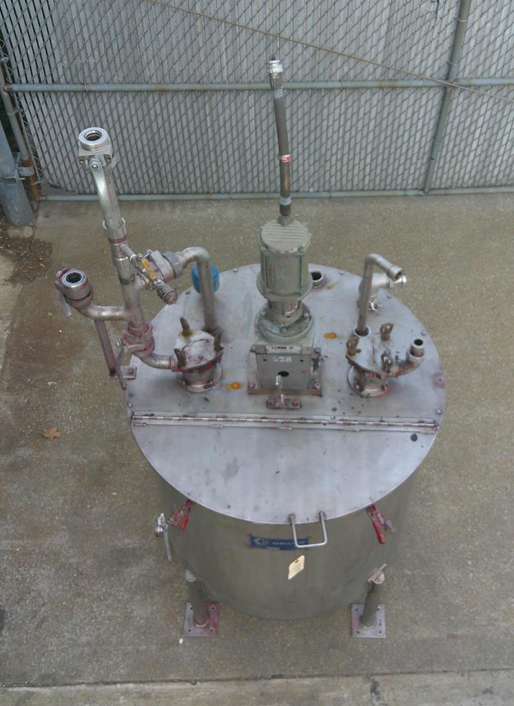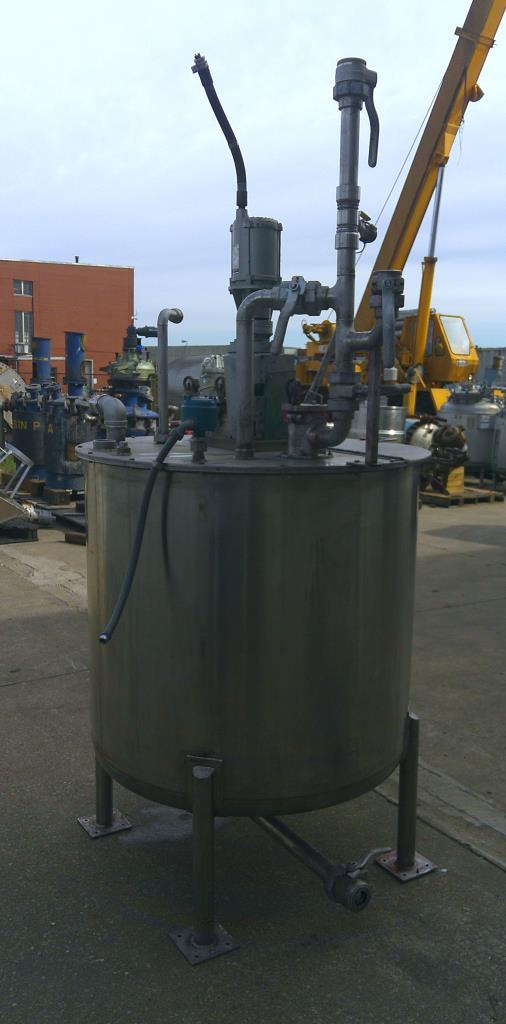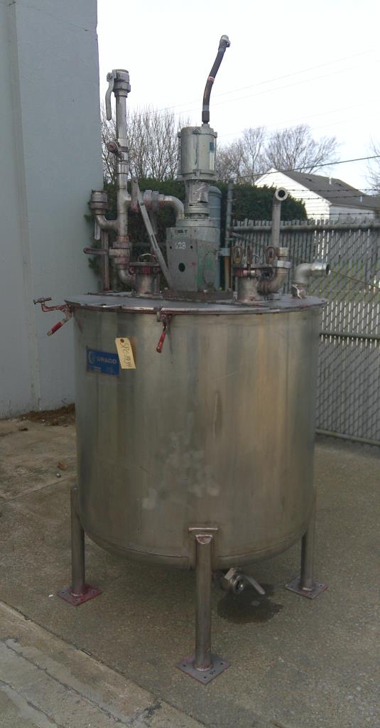 250 gallon vertical stainless steel mix tank. Tank dimensions are 42" diameter x 36" straight side with a 6" dish bottom. It has a removable bolt on top with an approximately 1/3 hinged lid. The tank has a Graco model LSA 117 top center entering 0.25 hp agitator with a 3 blade prop. tagged for hazardous locations, 208-230/460 vac 3 ph power required. The top has various pipe connections. It stands on 4 each 15" stainless steel pipe legs. The bottom has a 2" center discharge. Good Condition.Graco