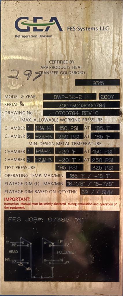SPC8807 Heat Exchanger 1045.9 sq.ft. GEA APV model 8WP-B2-2 plate heat exchanger 150 psi @ -20 to 185F and 250 psi @ -20 to 185F
