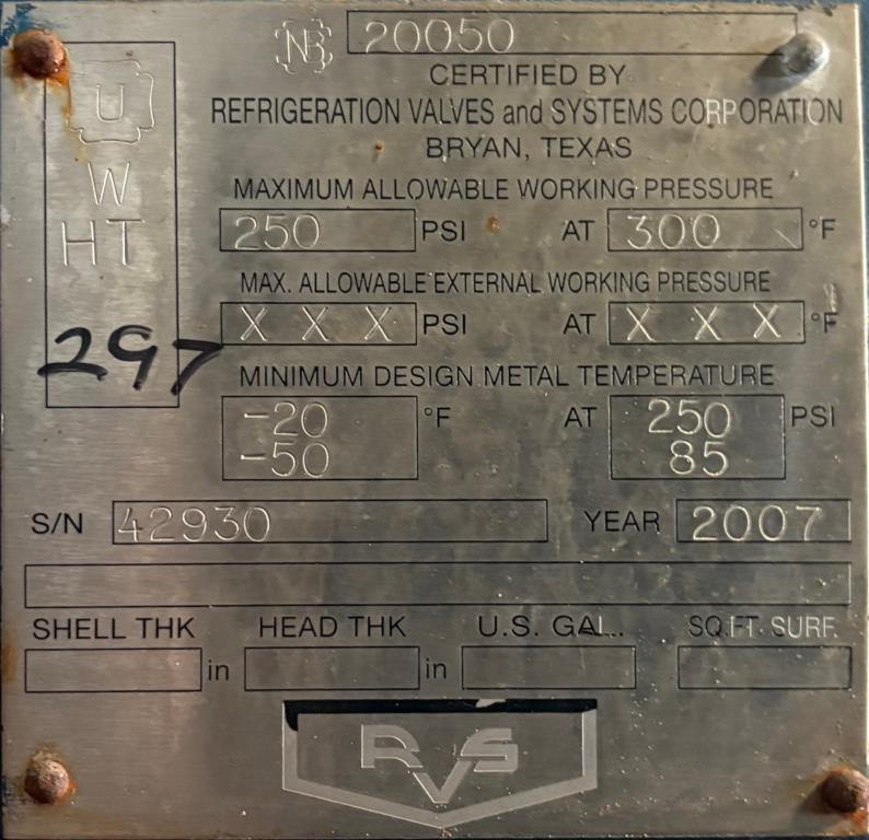 1045.9 sq.ft. GEA APV model 8WP- B2-2 heat exchanger with a 250 gallon horizontal liquid separation tank unitized on a carbon steel base. 316 stainless steel plates. The heat exchanger is rated for 150 psi @ -20 to 185F for chamber 1 and 250 psi@ -20 to 185F for chamber 2. The national board number for the heat exchanger is 9315. The liquid separator tank is rated for 250 psi @ -20 to 300F. Its national board number is 20050. This unit was part of an ammonia refrigeration system. Overall dimentions are 68.5" wide by 170" long by 90" tall.GEA APV