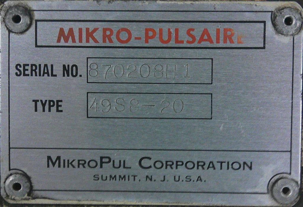 Mikro-Pulsaire 462 sq.ft.approx. carbon steel reverse pulse jet dust collector. Model 49S8-20. Dust collector used (49) 4.5" diameter x 8' long bag over cage filters. Dust collector has a 11" upper duct inlet, a 18" flanged nozzle on the side of the cone, an 8.5" diameter flanged outllet discharge on bottom. Serial # 870208H1. Total dimensions are 60" wide x 60" long x 168" tall. Needs a timer box. (We likely have one)Mikro-Pulsaire
