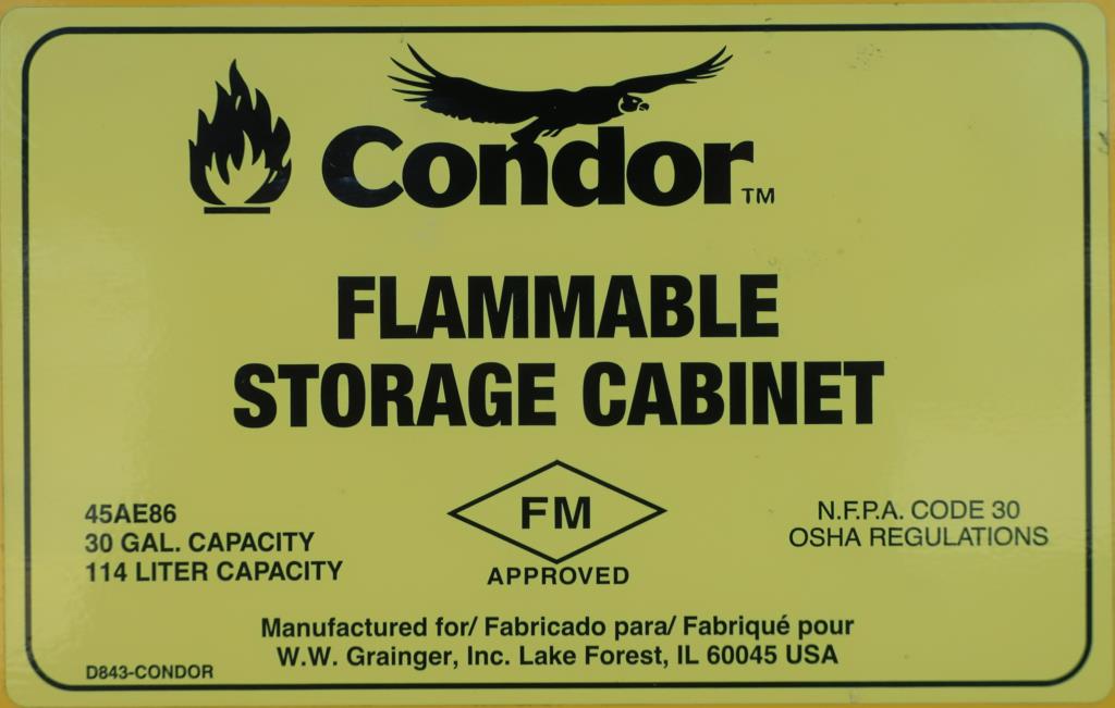 Condor two door model no. 45AE86 safety storage cabinet has a 30 gallon capacity and one adjustable shelf. The overall dimensions are 43.25” by 18” by 45.5” high. This unit features double wall construction with a 1.5” air space throughout the cabinet design. This cabinet complies with current OSHA regulations, is Factory Mutual Approved, and is designed in accordance with specifications set by the National Fire Protection Association.Condor