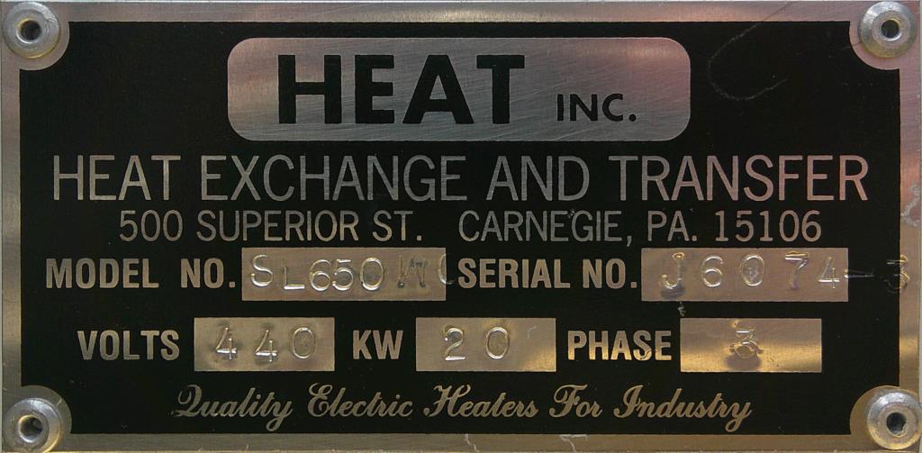 40 kw Heat Inc hot oil heater, Model SL650-WC-483 with dual 20 kw electric heaters each with 137 sq ft oil coolers and (2) 5 hp, Model1.5x3x10 Dean circulation pumps, nominally rated 25 gpm, 440 volt with controls, Serial # SL6074-2, built 1995.Heat Inc