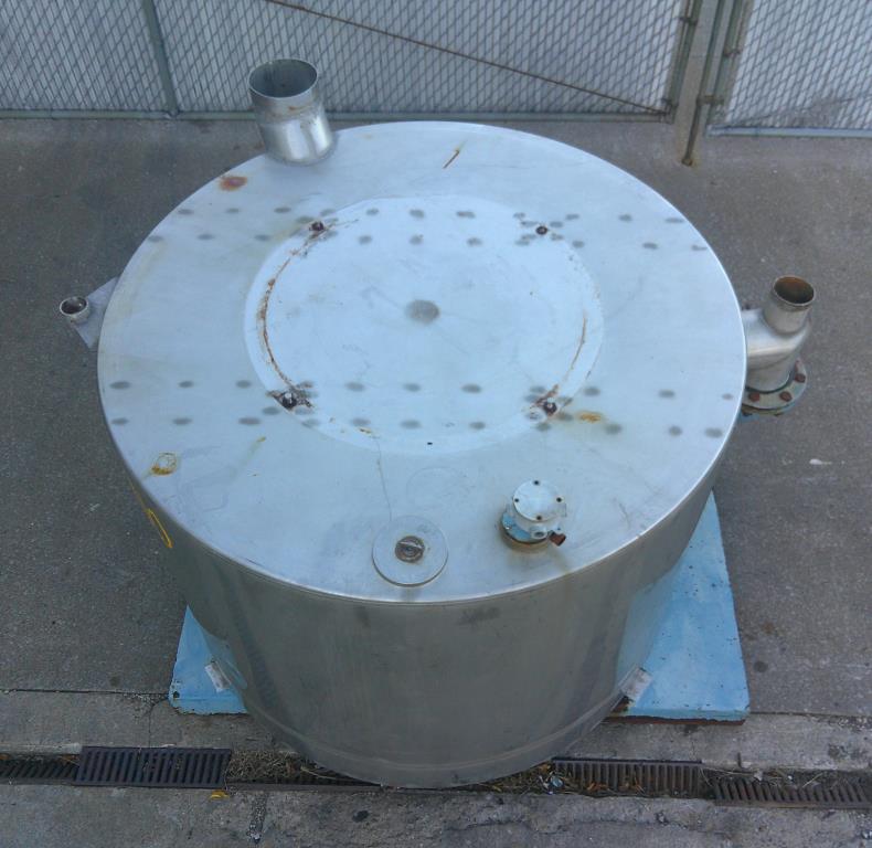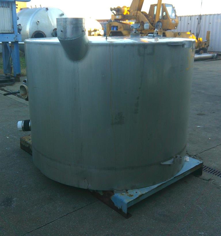 590 gallon stainless tank with flat bottom and flat top tank on carbon steel base. Side has 3/4" threaded coupling and 1/2" threaded coupling. Side has 6" Lap joint nozzle with gate valve and 4" pipe stub drain. Top has 8" duct work.Stainless Steel