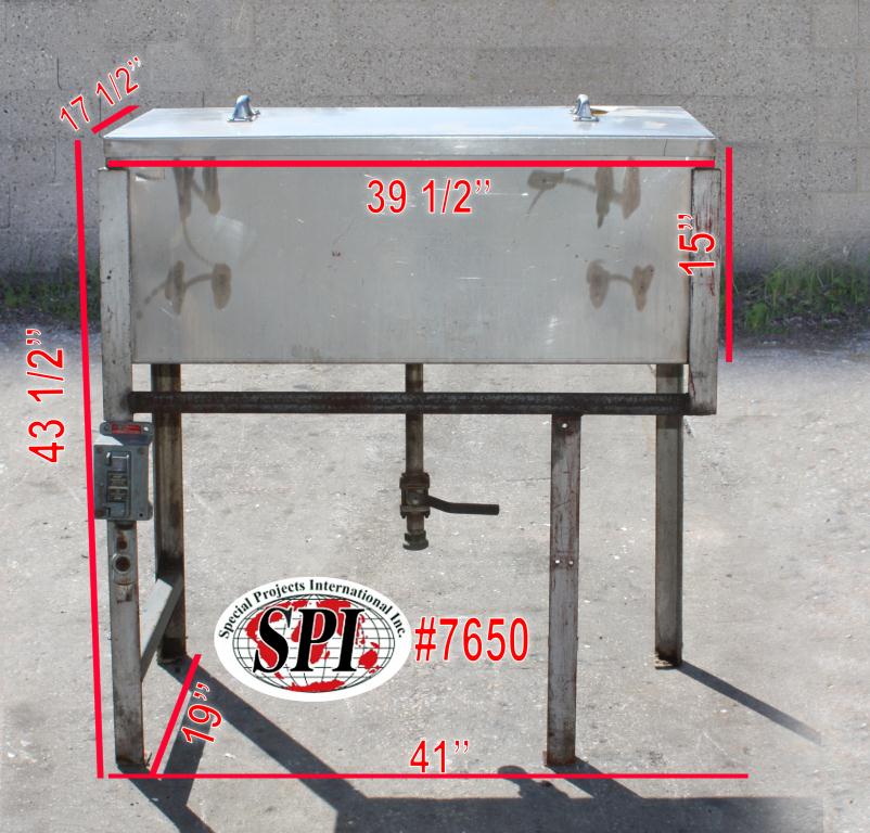 This 25 gallon trough is 41" tall. The basin's dimentions are 28" wide by 12.25" long by 18" tall. There is a 4" diameter drain. There is a frame that is 14.25" by 12.25" and 7" from the floor of the trough.Stainless Steel