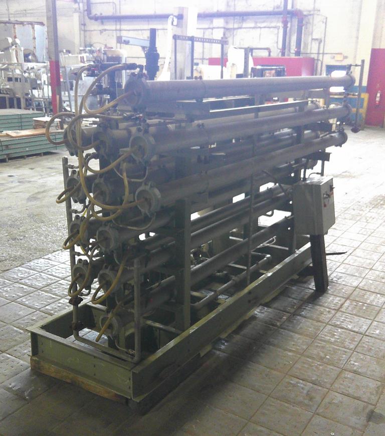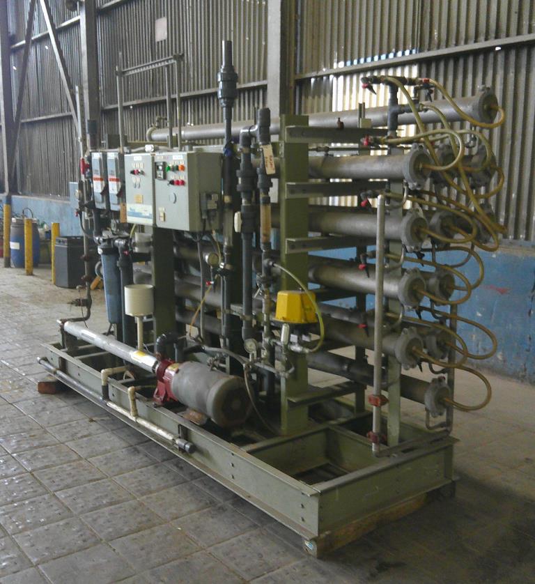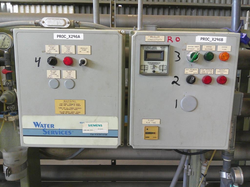 Water Services Corp. reverse osmosis filtration system. This unit has 12 stainless steel 4.5" dia. 126" long filter tubes, plc controls and a 15 hp GE Tonkaflo model SS2834D pressure pump that is rated for up to 25 gpm. This system is unitized on a fiberglass base. 230/460 vac 3 ph power required.Water Services Corp.