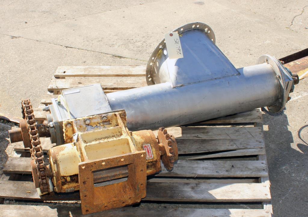 Carbon steel inclined screw conveyer 6" diameter x 17'-0" long screw. Bottom inlet is 6" x 9.5" oblong cut into the tube. Top outlet is 7" long x 6" wide rectangularwith slide gate. Overall size 28" wide x 19" tall x 19'-6" long. Drive is reducer HdRF325-60-/1-H-145TC with 60 to 1 ratio driven by TEFC 2HP electric motor, 1730 RPM, 208V, 3 phase.Carbon Steel