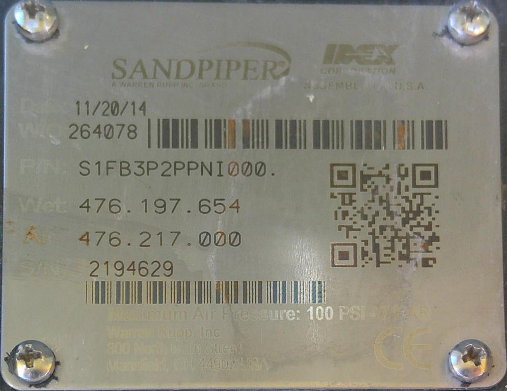 1" SandpiperIDEX Corp model S1FBP2PPN1000, SN 2194629, poly diaphragm pump, 100 PSI max air pressure. Requires pneumatic supply.Sandpiper IDEX Corp
