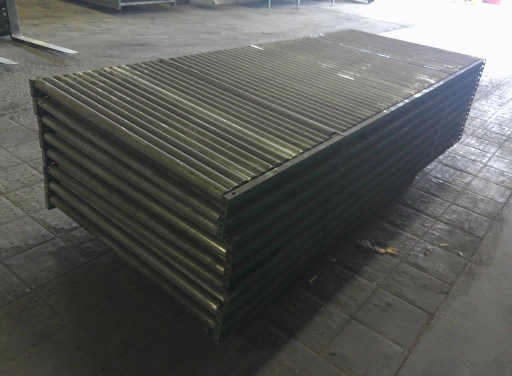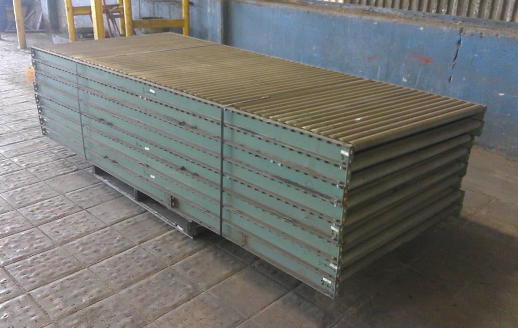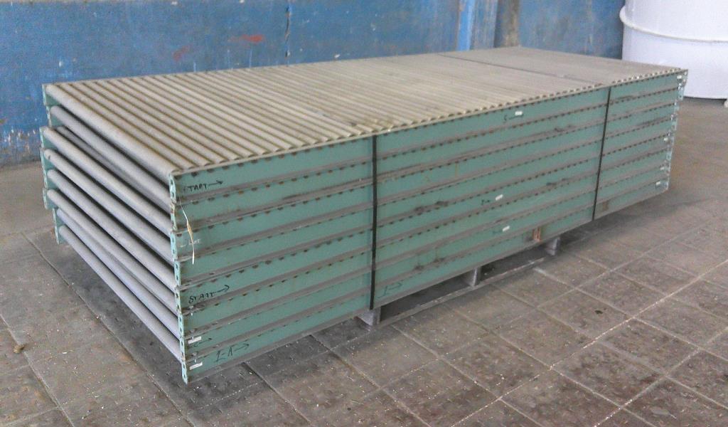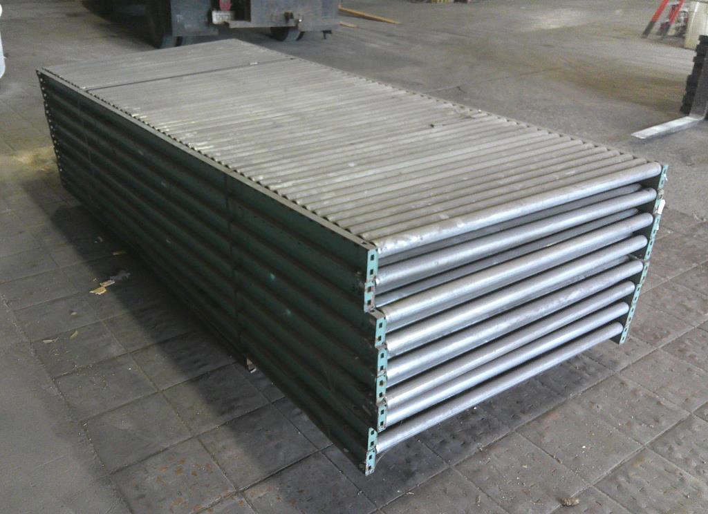 Lot of 8 4' wide by 10' long roller conveyors. The roller legnth is 47 3/4". They have a diameter of 1 7/8" and are placed 2" center to center. Occasionally, two rollers are replaced by one roller with a diameter of 3 3/8". Overall dimentions 120" long by 50 1/2" wide by 3 1/2" tall. These could be used for flow racks or unpowered pallet conveyor.Carbon Steel