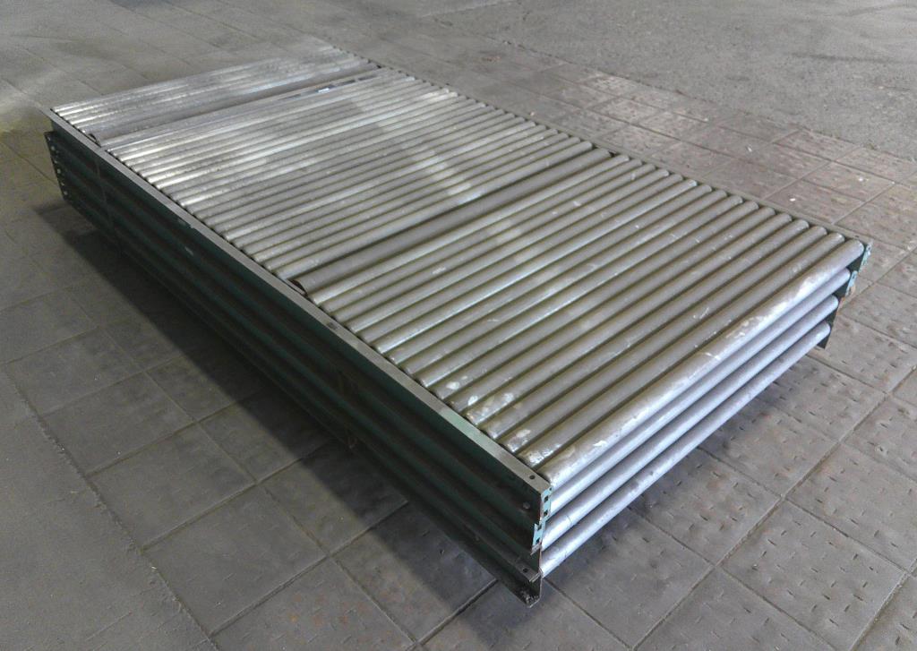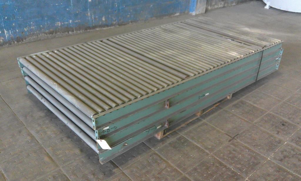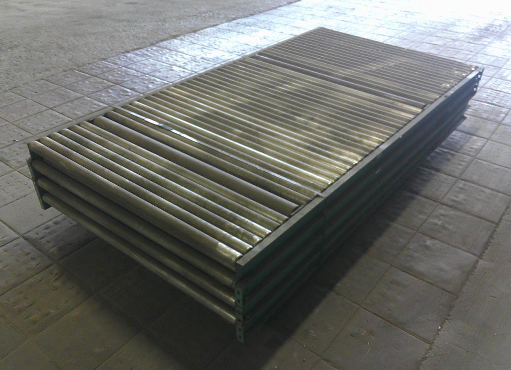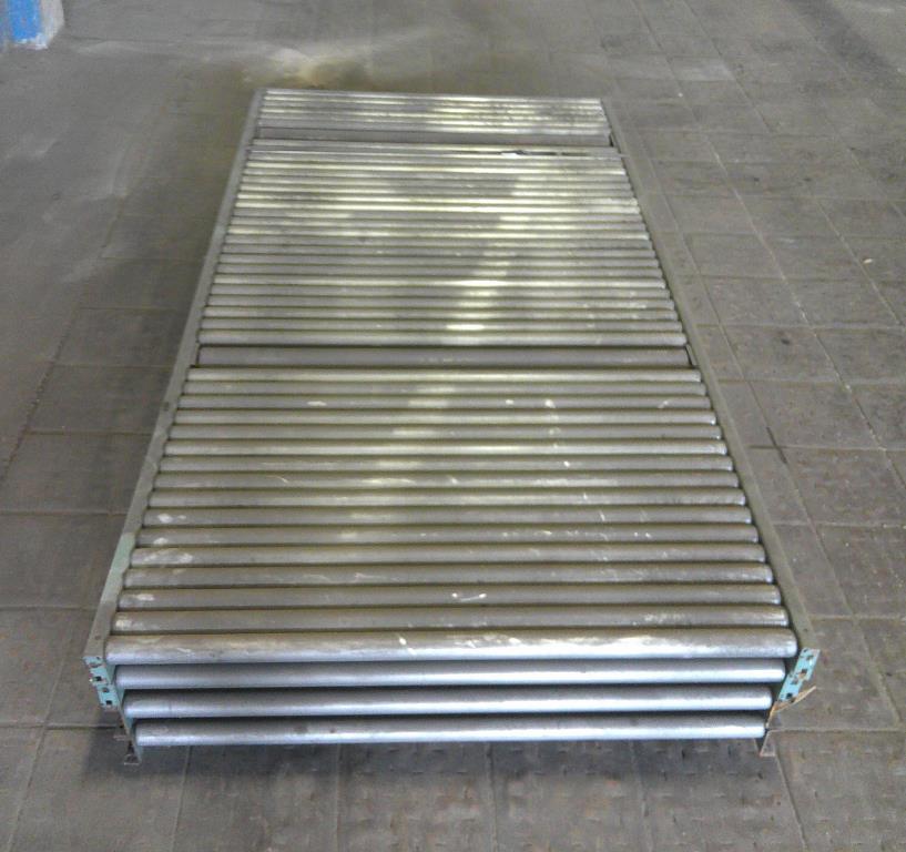 Lot of 4 4' wide by 8' long roller conveyors. The roller legnth is 47 3/4". They have a diameter of 1 7/8" and are placed 2" center to center. Occasionally, two rollers are replaced by one roller with a diameter of 3 3/8". Overall dimentions 96" long by 50 1/2" wide by 3 1/2" tall. These could be used for flow racks or unpowered pallet conveyor.Carbon Steel
