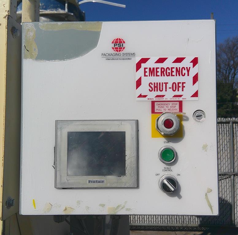 Packaging Systems International PSI model 780 air packer for 50 lb. valve bags. It has a stailess steel hopper and feed tube. This unit has a removable dust enclosure. The pneumatically operated bag door opening is 18.5" x 34". The bag chair is adjustable for different sized bags. It has an on board 7.5 hp positive displacement blower for product. It can fill about 3 bpm. 460 vac 3 ph power and air required. This unit is not designed for hazarous atmospheres. Serial number 99-24-4828. Overall dimensions are 53" wide x 93" long x 8' 9" tall.Packaging Systems International