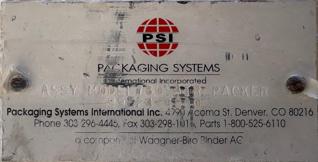 Packaging Systems International PSI model 780 air packer for 50 lb. valve bags. It has a stailess steel hopper and feed tube. This unit has a removable dust enclosure.The pneumatically operated bag door opening is 18.5" x 34". The bag chair is adjustable for different sized bags. It has an on board 7.5 hp positive displacement blower for product. It can fill about 3 bpm. 460 vac 3 ph power and air required. This unit is not designed for hazarous atmospheres. Serial number 99-24-4830. Overall dimensions are 53" wide x 93" long x 8' 9" tall.Packaging Systems International