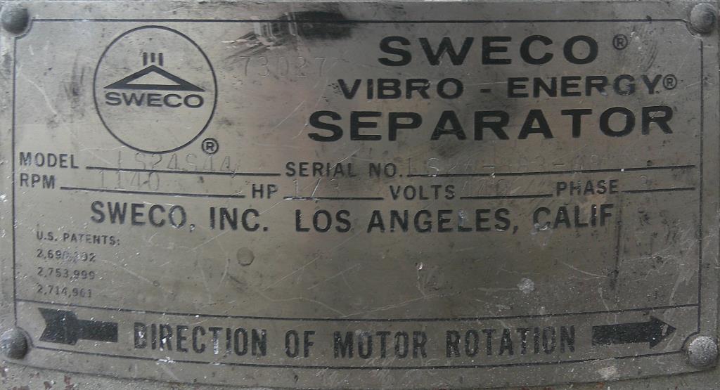 Sweco 2 deck circular shaker screener model # LS24S44, serial # LS24-883-68. The screener has a 1/3 hp motor that requires 440 vac 3 ph electricity. Has three frames with two screens. The frame outlets are 6" diameter. Overall dimensions 30" wide x 34" long x 30" tall.Sweco