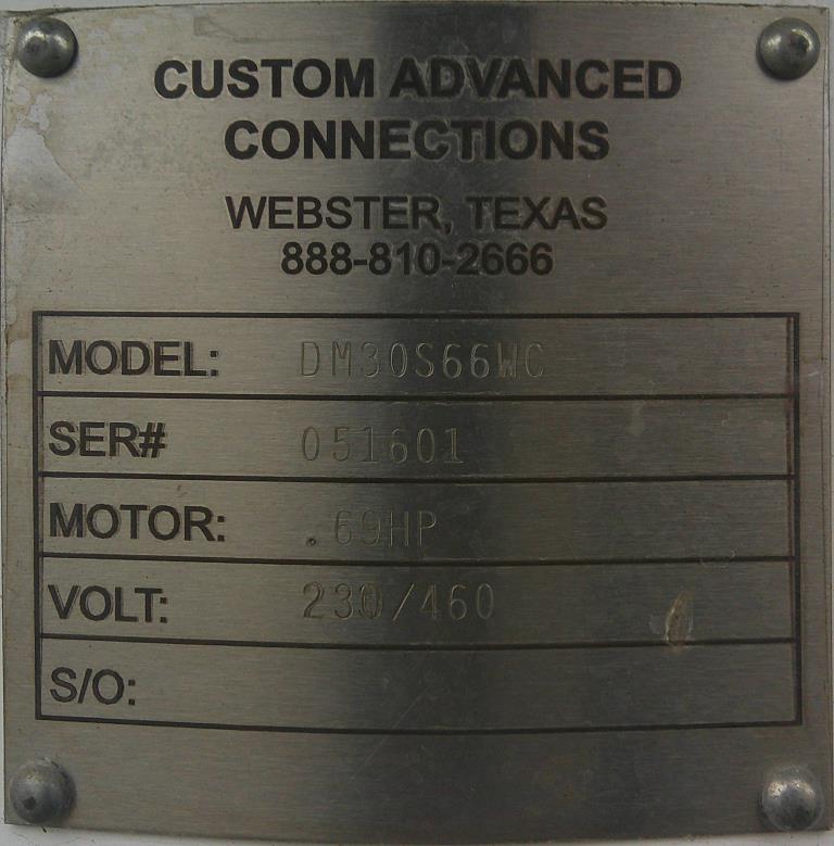 Custom Advanced Connections circular shaker screener model # DM30S66WC serial #051601. The screener has a 0.69 hp motor that requires 230/460 vac 3 ph electricity. Has one screen, two frames and one lid. Top frame has 6" outlet, Bottom frame has fabricated 8" wide x 4" tall oblong outlet. Overall size 33" wide x 40" long x 36" tall. Good condition.Custom Advanced Connections