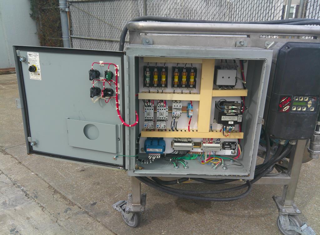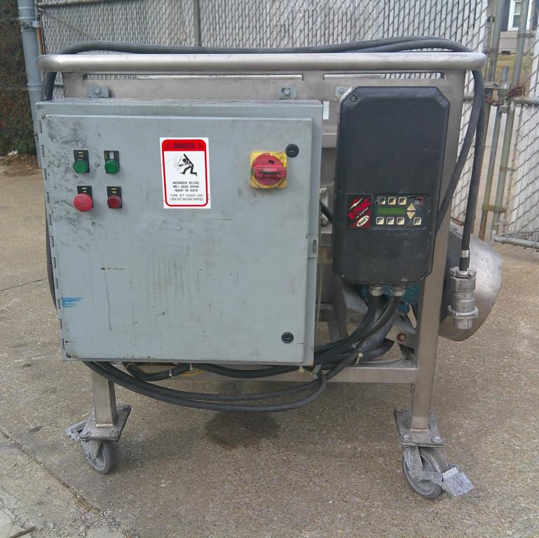 5 cu.ft. capacity Phauer model AJSP141-6DDPSW twin shaft paddle blender with a side entering chopper. Stainless steel constuction. The twin shaft paddle blender has a 1.5 hp drive on each shaft and the chopper is driven by a 3 hp motor. This unit is equipped with a small dosing tank with spray nozzels. The pipe to the spray nozzels is threaded brass but should be easy to replace with stainless fittings if necessary. The control panel is mounted at one end with a VFD. It is all mounted on a stand with casters for mobility. This unit requires 600 vac 3 ph and includes a 480 to 600 vac step up transformer. Overall dimensions are 80" wide x 52" long x 48" tall. Serial number 99110.Phlauer