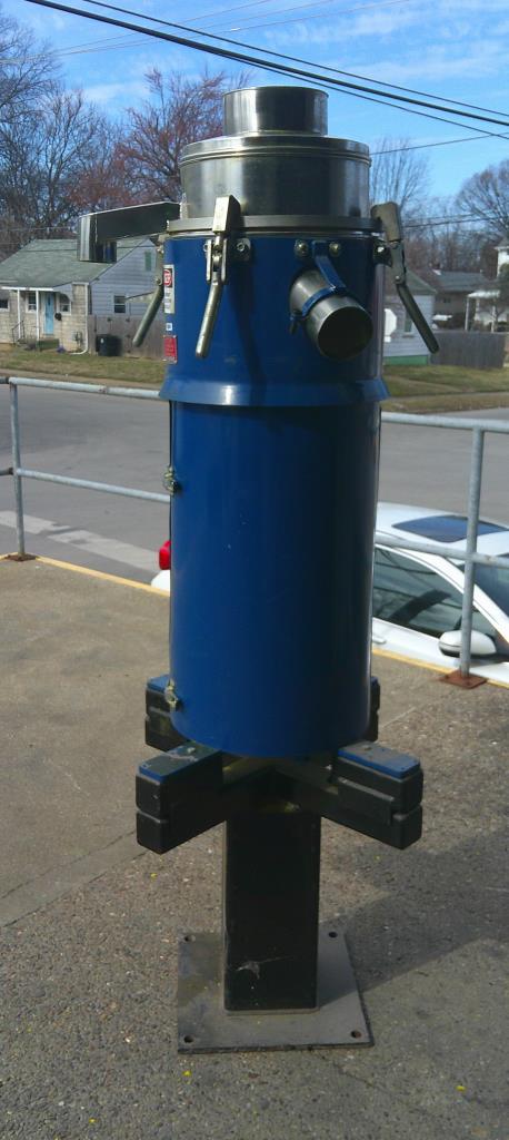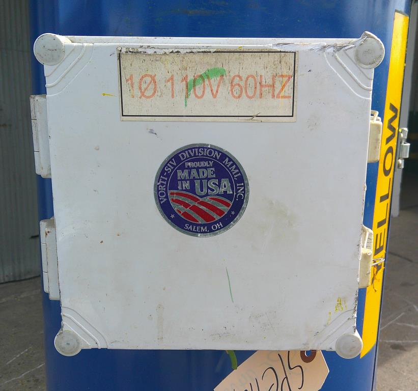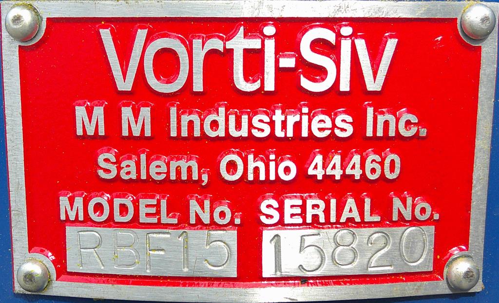 Vorti-Siv circular shaker screener model # RBF15, serial # 15820. The inlit is 7 3/4" in diameter and the two outlets are 2 3/4" and 3 7/8" in diameter. The screener sits on a 22 1/2" tall removable stand. Requires 110 vac 1 ph electricity. Overall dimentions 29" wide by 29" deep by 75" tall.Vorti-Siv