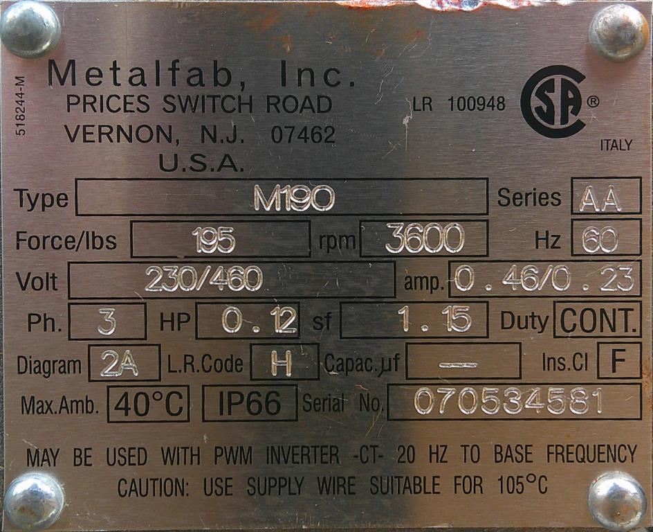 Metalfab model MT-3 volumetric screw feeder. Stainless steel construction. The hopper is approximately 2 cu.ft. The feed tube has an OD of 3.5" and a legnth of 22" to the center of the discharge. This screw feeder has a bin vibrator. 12" dia inlet opening and vent in the clamp on hopper lid. Driven by a 1 hp 230/460 vac 3 ph gearmotor. Serial # 806038. Good condition.Metalfab