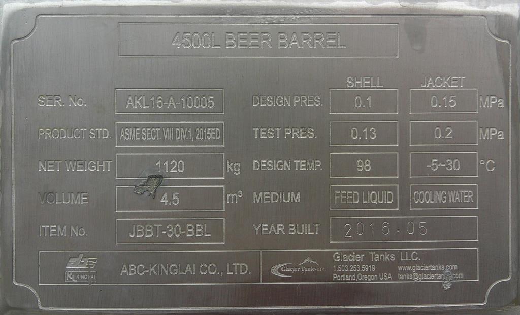 1188.77 gal (4500 L) Beer Barrel tank, serial # AKL16-A-10005 built by ABC- Kinglai Co, Ltd for Glacier Tanks LLC. Built 05/2016. This stainless steel tank is about 59" in diameter with a 81" straight side and 12" dished heads. Volume 4.5 m3. Design pressure shell 0.1 MPa, jacket 0.15 Mpa. Design temperature 98 degrees C. jacket on the side of tank only. Dished heads. Two top lift lugs. Tank has four legs. Top has one 3" tri clamp nozzle and one 1.25" tri clamp nozzle. Bottom nozzles one 1.25" tri clamp and one 1.5" tri clamp. Side nozzles one 16" x 13" elliptical hinged lid manway, five 1.25" tri clamp nozzles for jackets, two 1.25" tri clamp, two .75" tri clamp nozzles, and one .75" coupling. Overall dimensions70" x 70" x 122" tall.Glacier Tanks, LLC