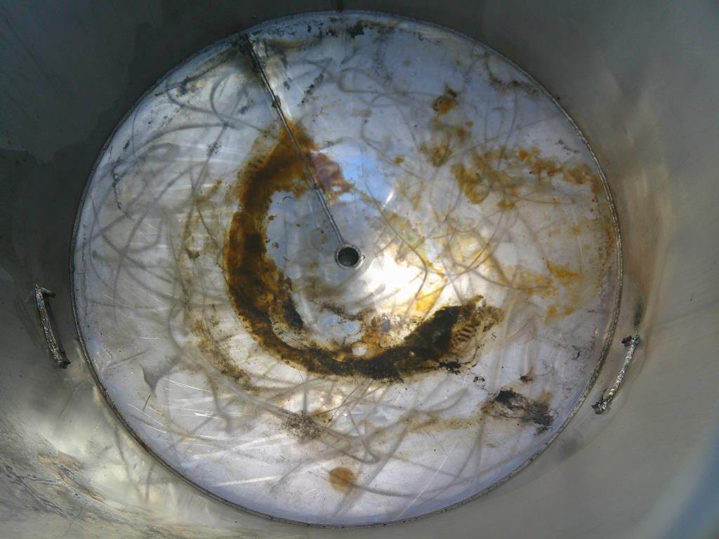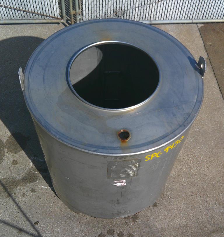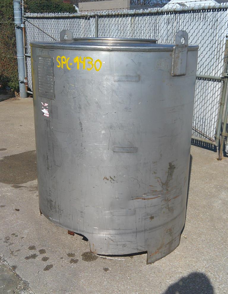 Clawson Tank Company 330 gallon stainless steel tank. Serial # 81192DM6. The diameter is 45" and the straight side legnth is 48". The manway on top is 22.5" in diameter. No lid. The inlet on top and the outlet below have an inside diameter of 2.25" and are threaded. Overall dimentions are 46" wide by 46" long by 60" tall.Clawson Tank Company