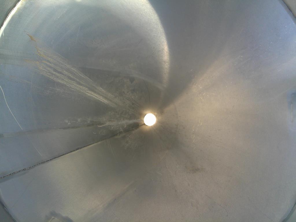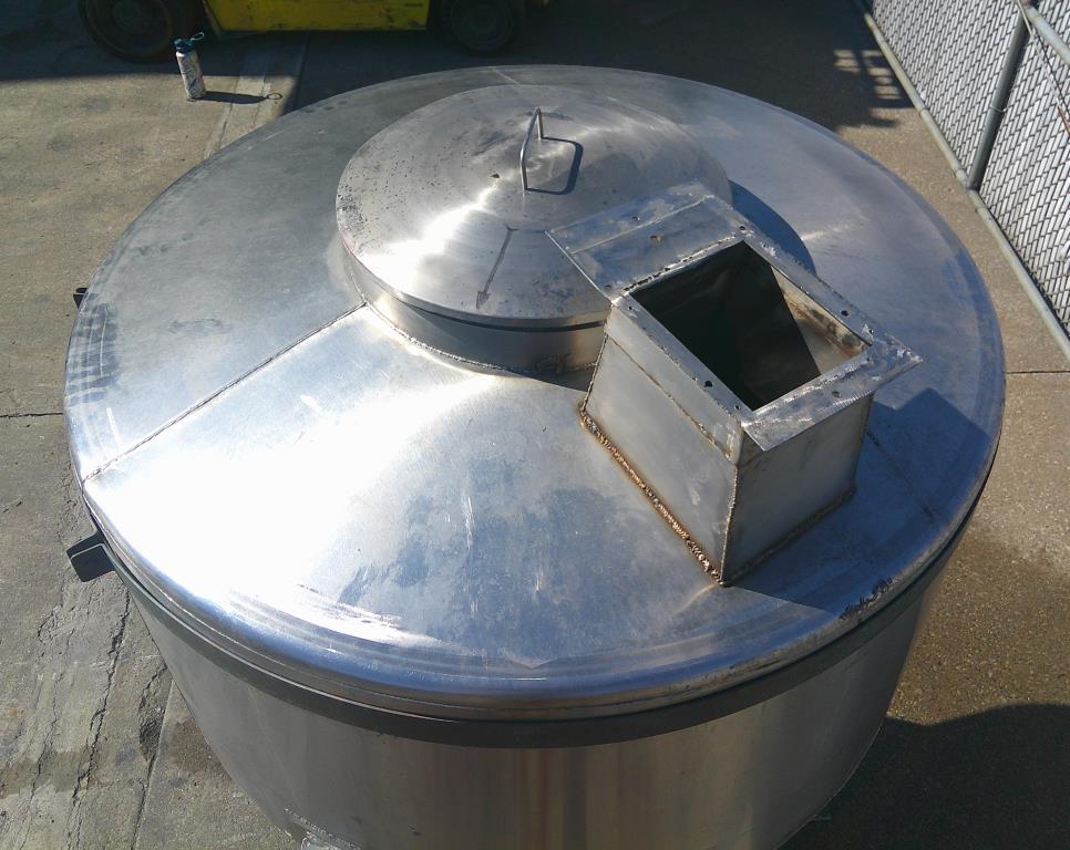 380 gallon vertical cone bottom stainless steel tank. 52" OD x 24" straight side. 52" long cone. Flat top with 20" lidded manway and 8" x 7" open chute. 3/4" triclamp side nozzle. Bottom drain 4". Tank has three legsStainless Steel