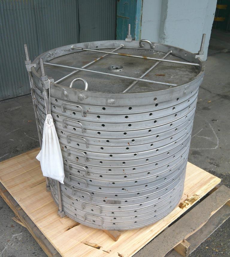 Horizontal plate stack for 33" sparkler filter. There are 18 shallow stainless steel plates. Bolted together with 4 tie rods to form 35.5" tall stack.Sparkler